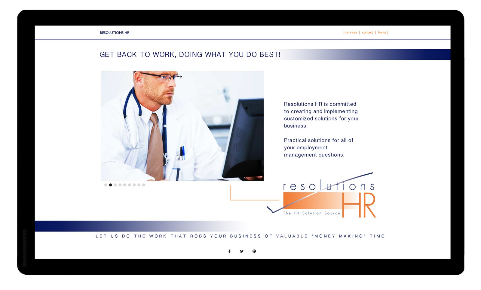 This HR Firm requested a sophisticated, elegant website design that would appeal to professional business owners. Having a modern look with a connection to social media was a priority. We created the entire brand for this firm, including the name. The name of the company sends a message that this is the firm to contact to receive resolutions for your HR management. The checkmark in the logo is implies that by contacting this firm, a business owner has checked something off of their list of things to handle.