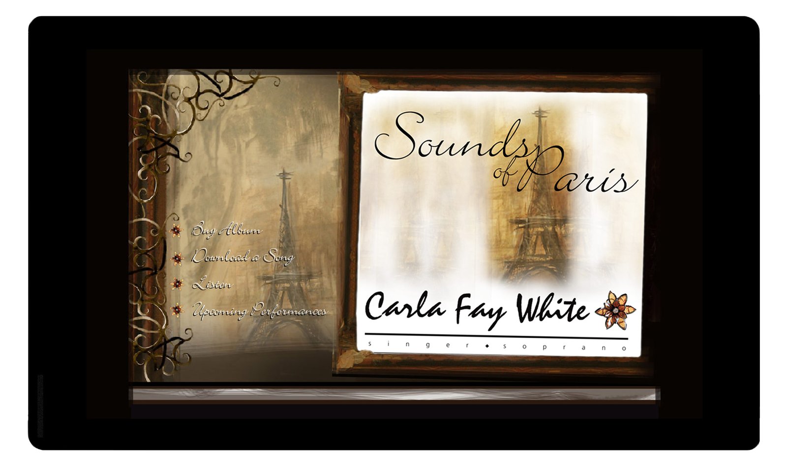 This website design was created for a performing artist to market her CD, "Sounds of Paris. In addition to the website design, we also designed her logo, CD cover, and three different versions of her corporate stationery. Our project director personally hand painted the image of the Eiffel Tower used for the designs. The design concept for this branding project integrated a combination of rustic and vintage styles. This was a limited edition CD that completely sold out.